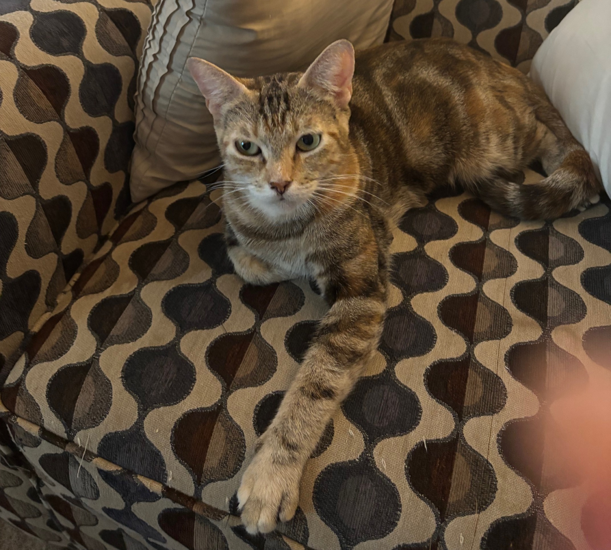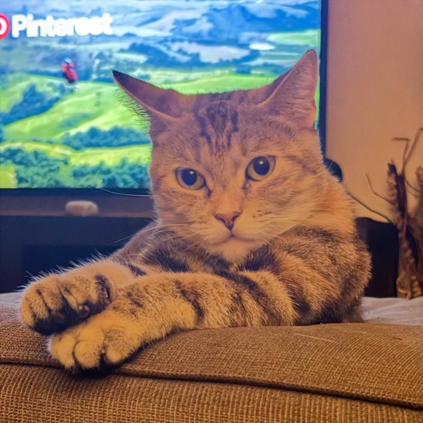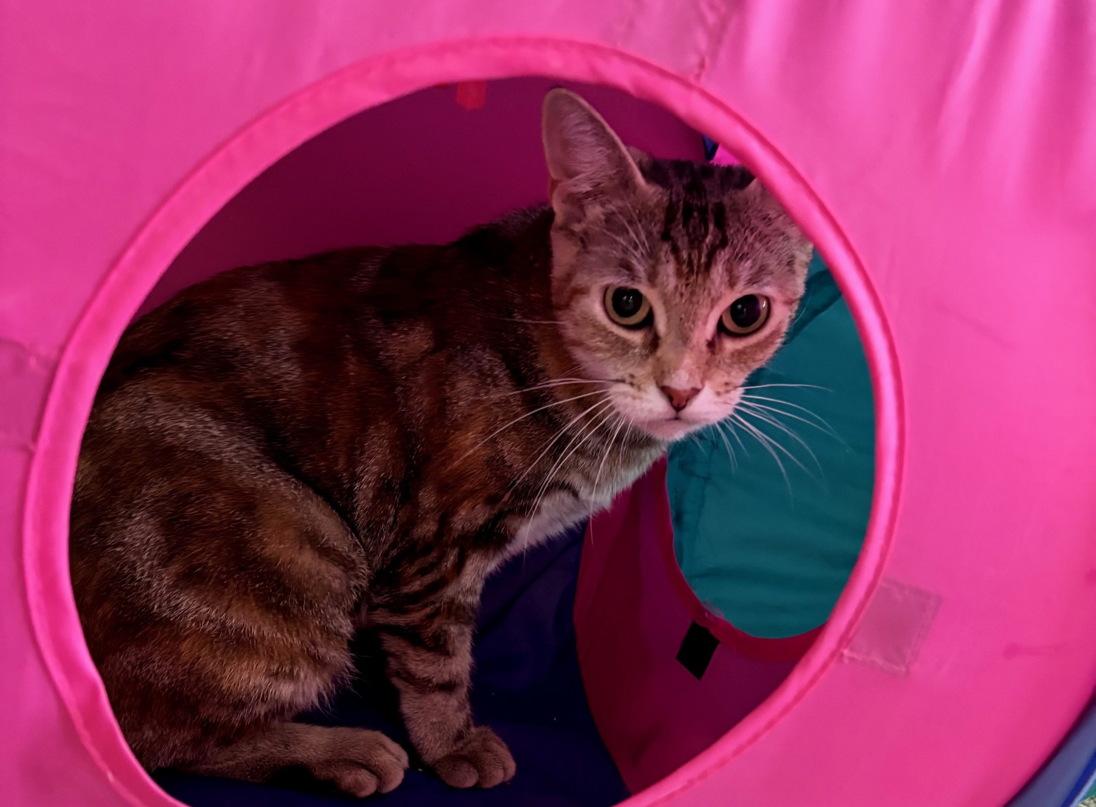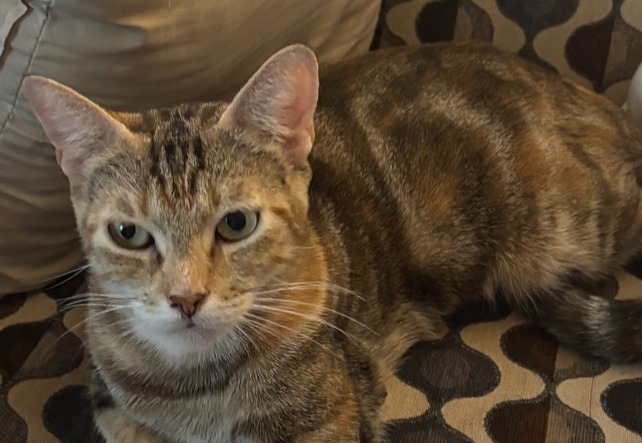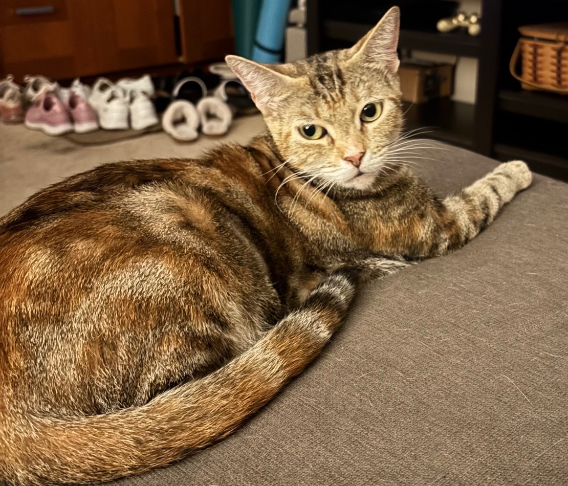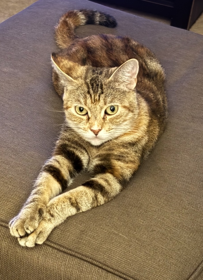 Now fully vetted, well-fed, and looking more fabulous every day, this gorgeous 8-month-old “tabico” (tabby + calico) is ready for her happily-ever-after. She’s past the chaotic kitten phase but still playful, curious, and endlessly loving.